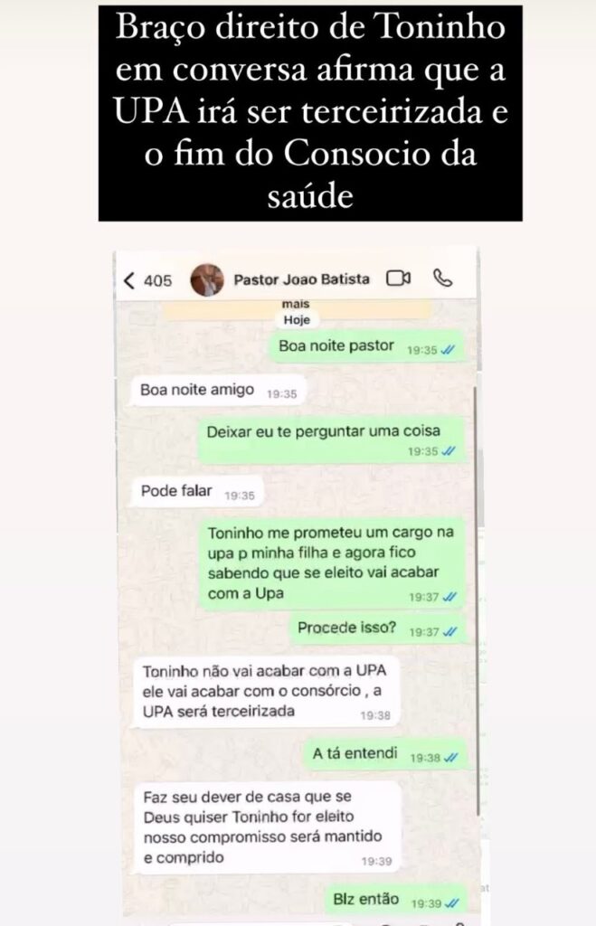 Na manhã desta última quarta-feira (24), uma publicação nas redes sociais gerou grande repercussão no município de Marataízes, conhecido como a Pérola Capixaba. A publicação, identificada como fake news, consiste em um falso print de tela e um vídeo montado onde o coordenador de campanha, Pastor João Batista, supostamente afirma em uma conversa no WhatsApp que a Unidade de Pronto Atendimento (UPA) será terceirizada e o Consórcio da Saúde será encerrado. A conversa falsa ainda insinua que o candidato Toninho teria prometido um cargo para a autora oculta da mensagem.