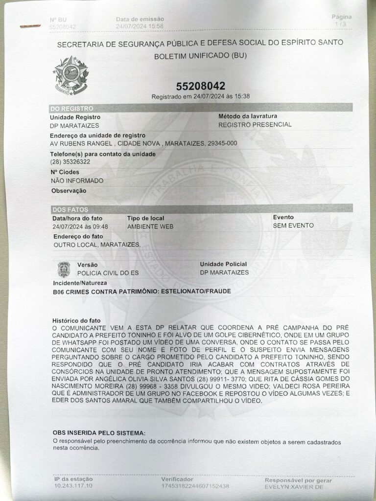 O caso foi formalmente registrado na delegacia de polícia de Marataízes e também no Ministério Público Eleitoral, que agora busca identificar e responsabilizar os autores de acordo com a lei.