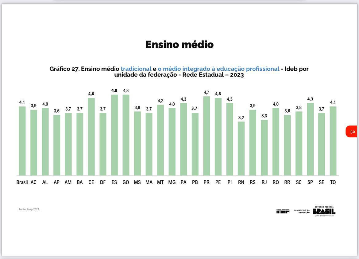 O Espírito Santo alcançou 1º lugar entre as redes Estaduais de Ensino do Brasil, na etapa do Ensino Médio, com 4,8 no Índice de Desenvolvimento da Educação Básica (Ideb). Nos anos iniciais da educação básica ficou em 5º lugar com 6,3 e nos anos finais do Ensino Fundamental em 3º lugar com nota 5,3. Os resultados foram divulgados nesta terça-feira (14) pelo Ministério da Educação (MEC) e demonstram uma melhora nos indicadores do Estado em todas as etapas avaliadas.