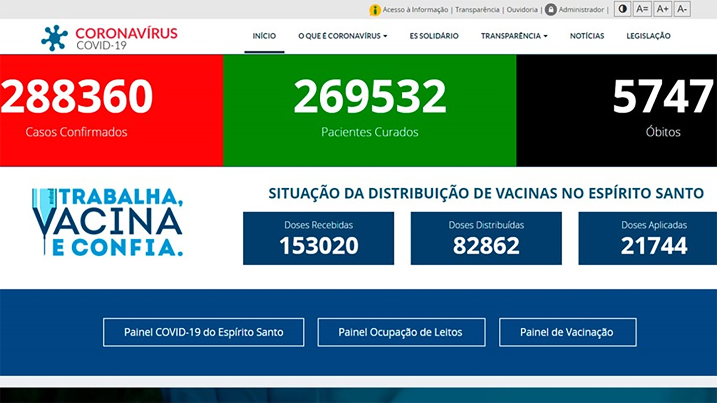 O Governo do Estado deu mais um passo para garantir a transparência nas informações sobre o novo Coronavírus (Covid-19): os dados sobre vacinas recebidas, distribuídas e aplicadas no Espírito Santo já estão disponíveis no site Coronavírus (www.coronavirus.es.gov.br). Além dos números atualizados diariamente, a página conta com um painel interativo com detalhes sobre a imunização, como o total de doses enviadas para cada município, a distribuição por grupo prioritário e o percentual de cobertura alcançado em cada grupo.