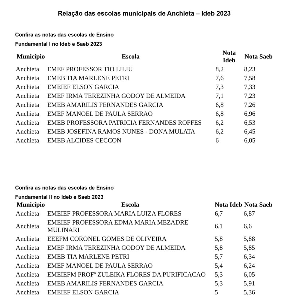 Confira abaixo as notas das escolas municipais de Anchieta que se destacaram no Ideb e no Sistema de Avaliação da Educação Básica (Saeb) de 2023 no e ensino fundamental I (1° ao 5° ano) e ensino fundamental II (6° ao 9° ano), com base nas informações divulgadas pelo Instituto Nacional de Estudos e Pesquisas Educacionais Anísio Teixeira (Inep) no último dia 14 de agosto.