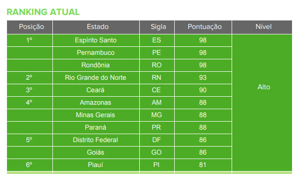 O Estado, que já ocupava a terceira posição nas últimas avaliações, com nível de transparência classificado como alto, chegou ao 1º lugar ao passar a divulgar boletim diário com o número de leitos ocupados e a apresentar dados sobre a ocorrência de outras doenças respiratórias. A pontuação do Espírito Santo passou de 93 a 98 (de um máximo de 100 pontos).