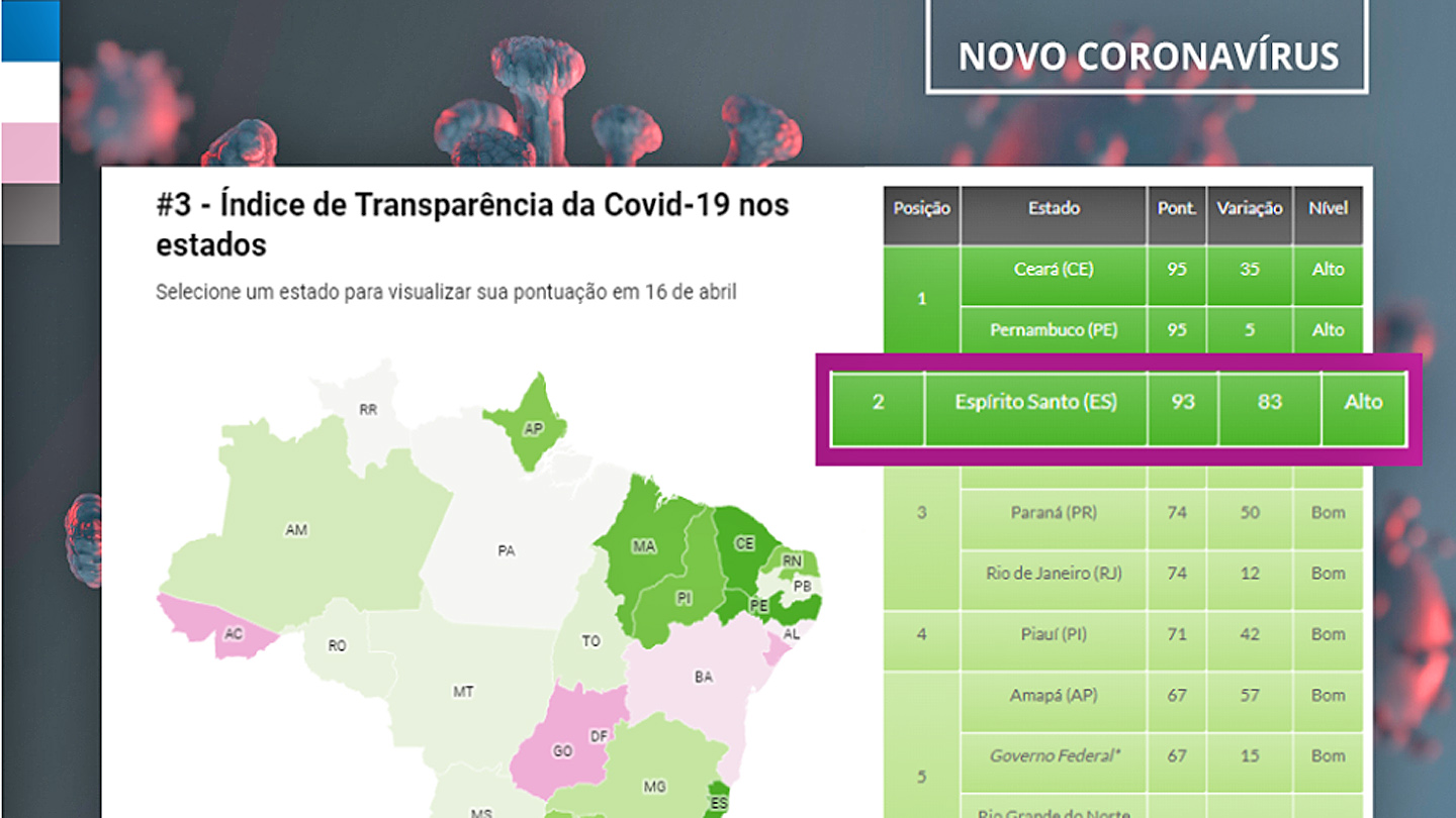 No ranking elaborado pela instituição (CLIQUE AQUI E ACESSE O RANKING COMPLETO), o Espírito Santo foi classificado entre os três estados com nível alto de transparência, ao lado do Ceará e de Pernambuco, obtendo a pontuação 93 em uma escala de zero a 100. A nota mostrou a rápida evolução da transparência dos dados no Estado, que inicialmente havia sido enquadrado na categoria opaca, na avaliação realizada no dia 9 de abril. Em apenas uma semana, o Espírito Santo passou a ocupar o topo da escala.