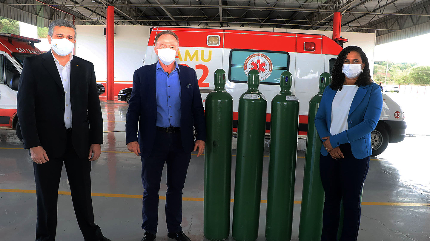 O Governo do Espírito Santo recebeu cerca de 100 cilindros de oxigênio, que auxiliarão as unidades hospitalares estaduais no enfrentamento ao novo Coronavírus (Covid-19). A doação foi realizada pela empresa Petrobras. A entrega dos insumos teve a presença do governador do Estado, Renato Casagrande, da vice-governadora Jacqueline Moraes e do representante da empresa. Os cilindros serão destinados a sete unidades referências no tratamento aos casos moderados e graves da Covid-19.