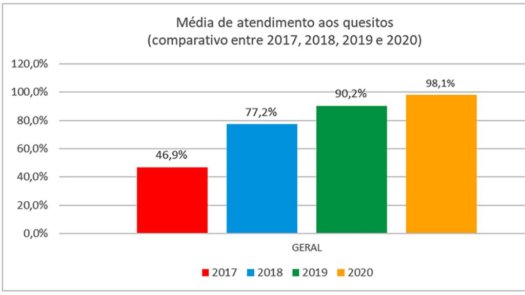 Entre os órgãos avaliados, 96% obtiveram classificação “A”, com pontuação de 94% a 100%; e 4%, “B” (75% a 93%). A avaliação mostra a evolução na transparência dos dados no Estado: em 2017, quando foi realizado o primeiro estudo, a média de atendimento aos quesitos da LAI foi de 46,9%. Em 2018, passou para 77,2%; em 2019, para 90,2%; e agora, em 2020, chegou a 98,1%. Entre os 56 órgãos avaliados, 31 obtiveram a nota máxima, cumprindo 100% dos quesitos.