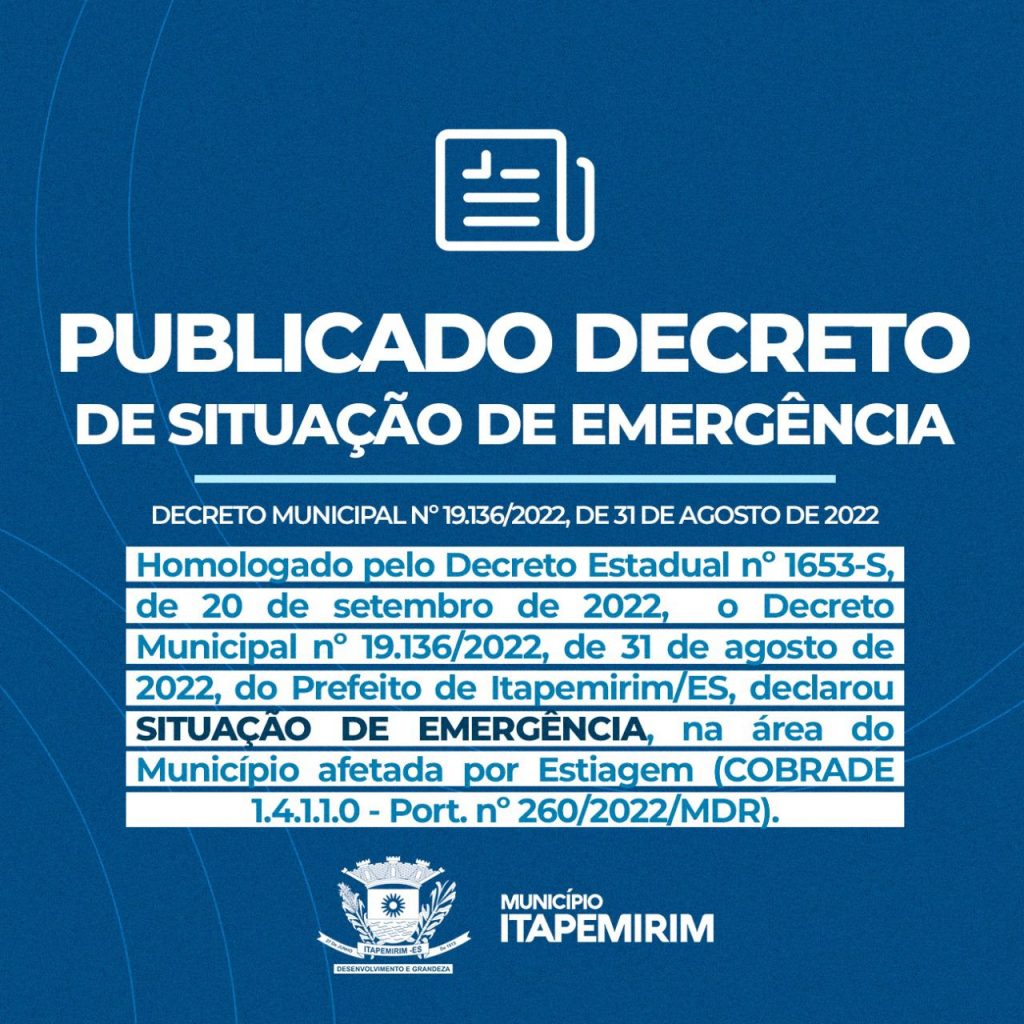 Diante da estiagem que afeta Itapemirim e toda a região, o prefeito Dr. Antônio Rocha, após estudos técnicos e relatórios apresentados pela Secretaria Municipal de Agricultura e Desenvolvimento Rural, em conjunto com a Secretaria Municipal de Defesa Social (em parceria junto com a Defesa Civil Estadual), decretou Situação de Emergência no Município, por meio do Decreto n. 19.136/2022, de 31 de agosto de 2022.
