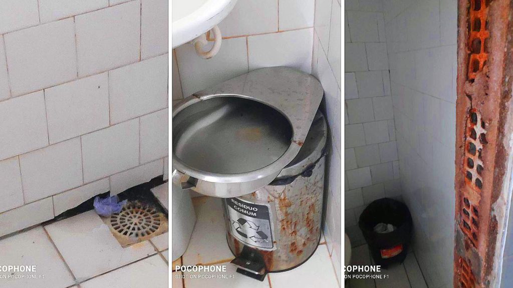 O ambiente conta apenas com um único banheiro, que não possui tranca, para ser usado por pacientes homens, mulheres e servidores da unidade. Tudo isso sem contar que alguns dos pacientes, um deles encontrado no chão, ainda dividem o espaço com uma lixeira.