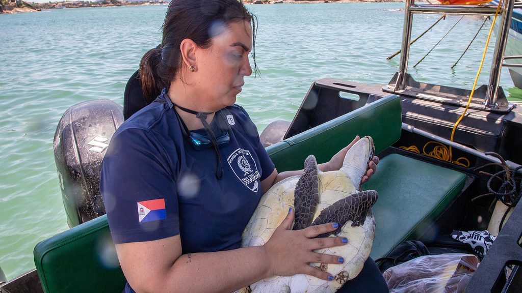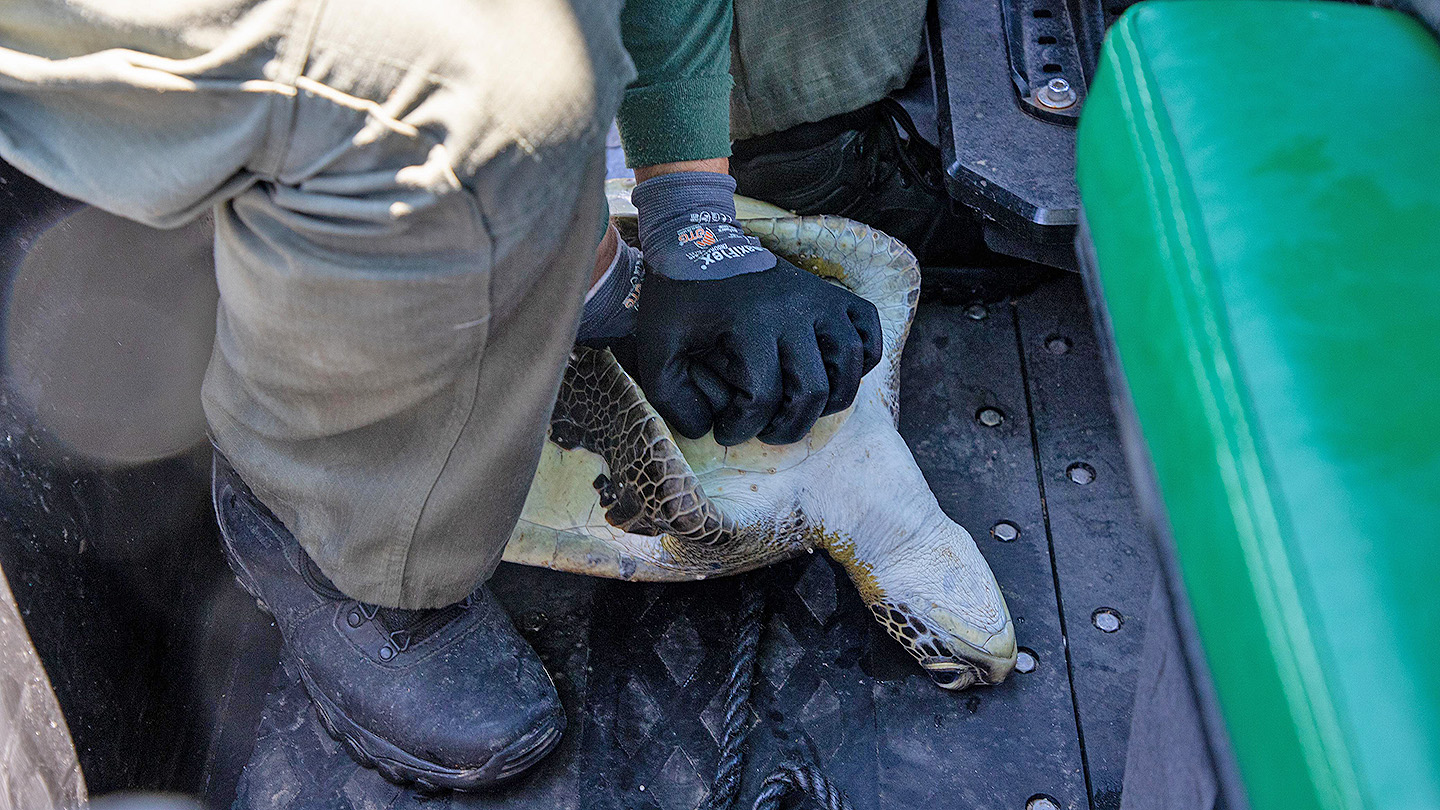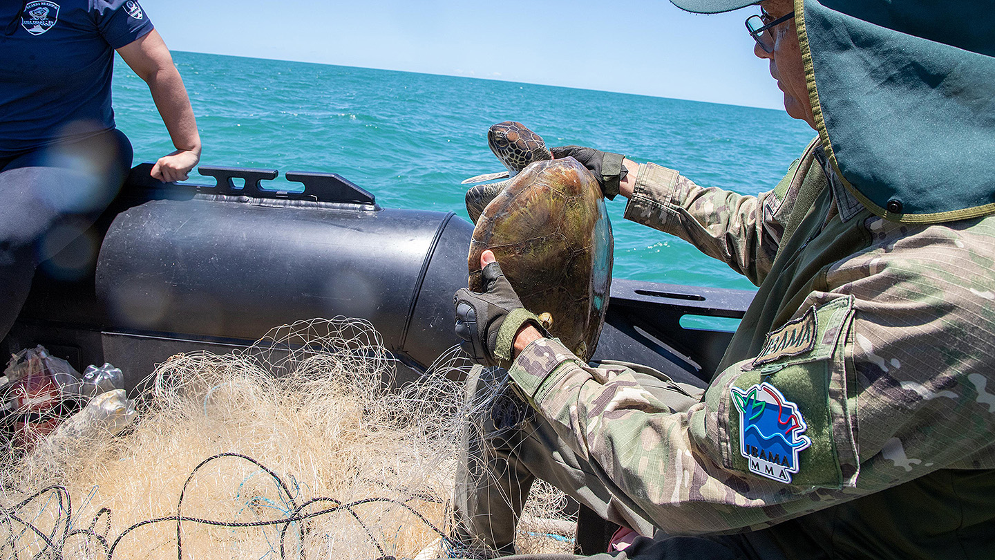 Durante a operação, foi descoberto o corpo de uma tartaruga presa nas redes, identificada como da espécie Verde (Chelonia mydas), mas não havia pescado retido.