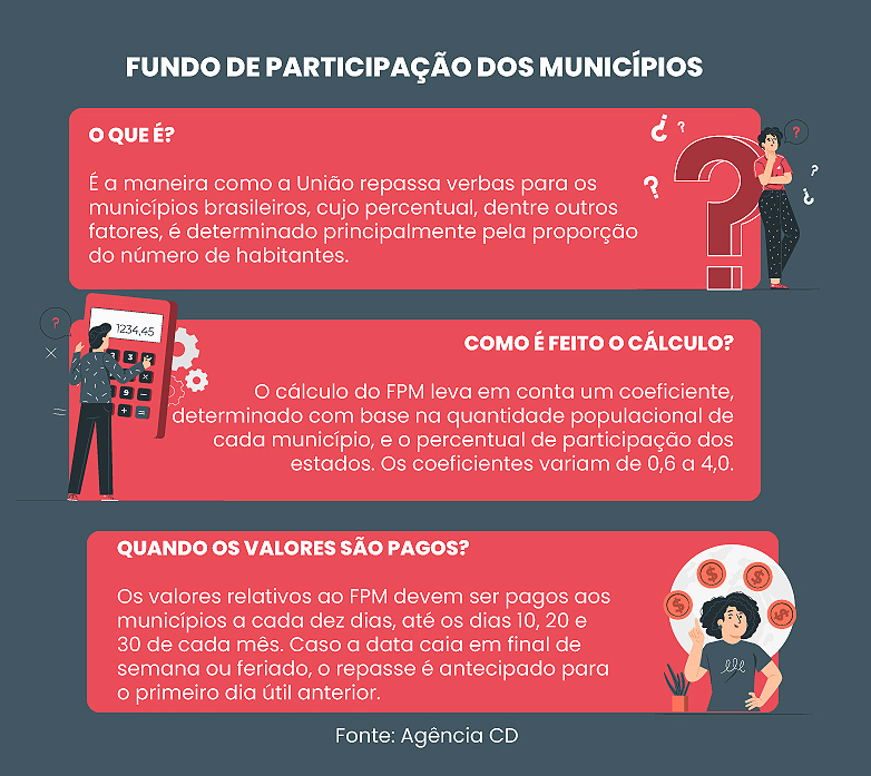 Os valores relativos ao fundo são pagos aos municípios a cada dez dias, até os dias 10, 20 e 30 de cada mês. Caso a data caia em final de semana ou feriado, o repasse é antecipado para o primeiro dia útil anterior.