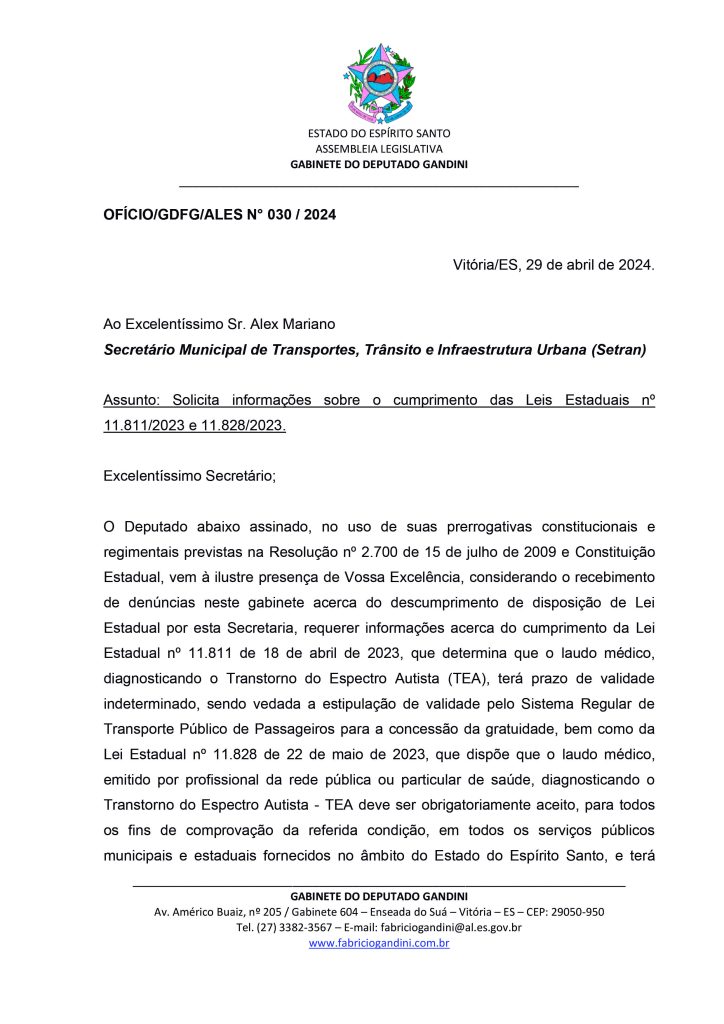 O deputado estadual Fabrício Gandini (PSD) cobrou explicações do secretário de Transportes, Trânsito e Infraestrutura de Vitória, Alex Mariano, sobre o porquê as leis estaduais de sua autoria que tratam da aceitação de laudo permanente para pessoas com Transtorno de Espectro Autista (TEA) não estão sendo cumpridas pela gestão do prefeito da capital, Lorenzo Pazolini (Republicanos).