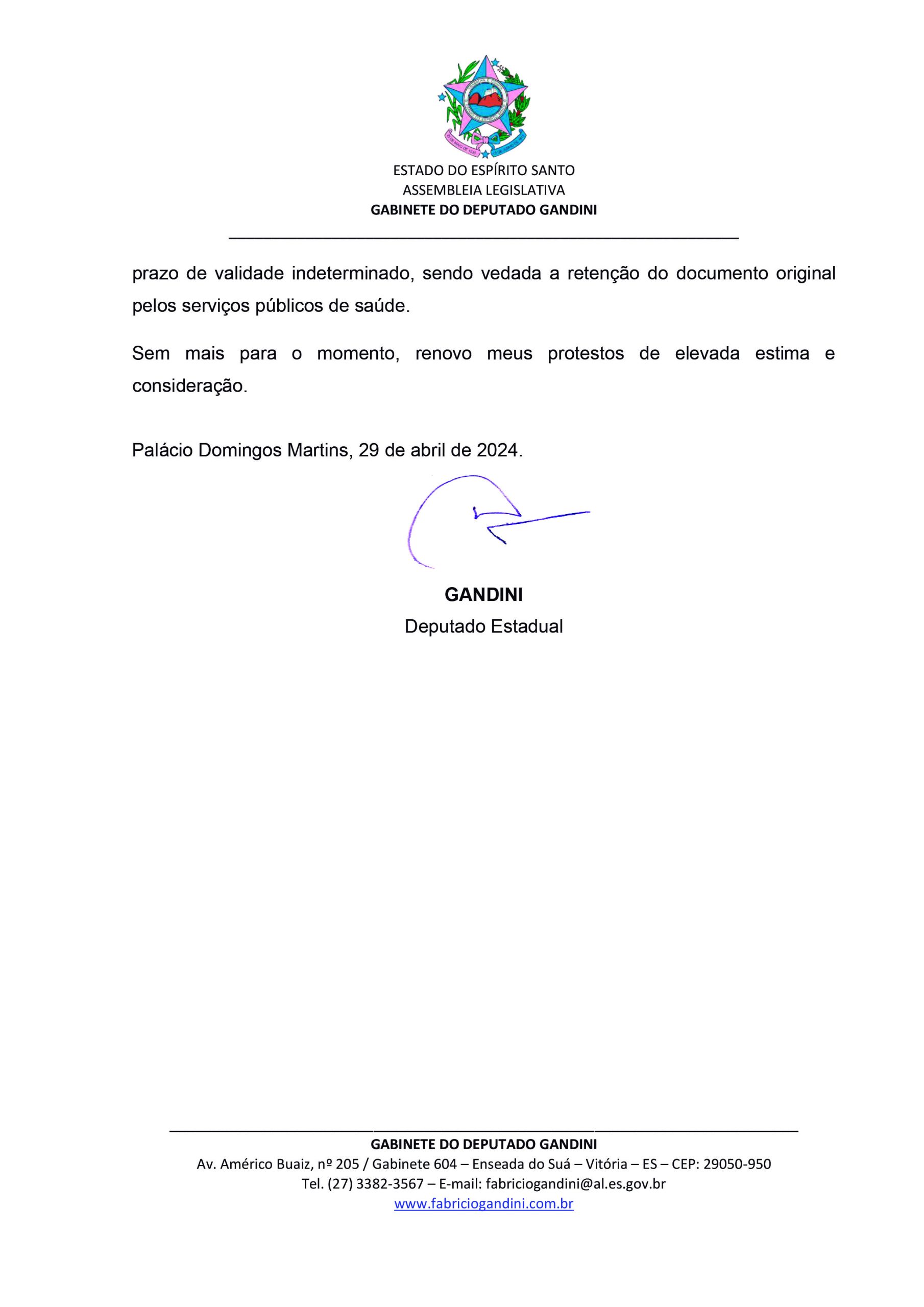 Gandini também assina a Lei Estadual nº 11.828, de 22 de maio de 2023, que dispõe que o laudo médico, emitido por profissional da rede pública ou particular de saúde, diagnosticando o transtorno, deve ser obrigatoriamente aceito, para todos os fins de comprovação da referida condição, em todos os serviços públicos municipais e estaduais fornecidos no âmbito do Estado do Espírito Santo.