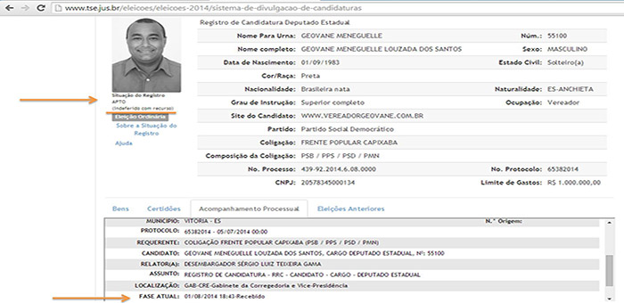 GEOVANE (1)O vereador de Anchieta e candidato a Deputado Estadual, Geovane Meneguelle (PSD), entrou com recurso na justiça eleitoral na última quinta-feira (31/07), um dia depois, sexta-feira (01/08) seu nome já figura apto no site da justiça para a corrida eleitoral deste ano.