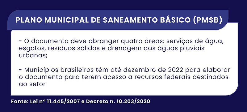 A Lei nº 11.445/2007, conhecida como Lei do Saneamento Básico, estabelece uma série de diretrizes ao setor e determina que os municípios brasileiros devem elaborar um Plano de Saneamento Básico. Um decreto publicado pelo presidente Jair Bolsonaro neste ano obriga os gestores municipais a elaborem o documento até o fim de 2022.