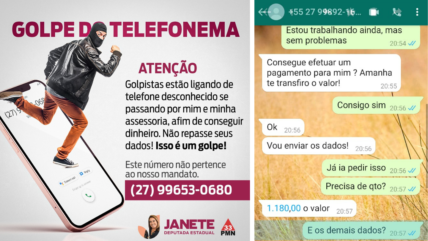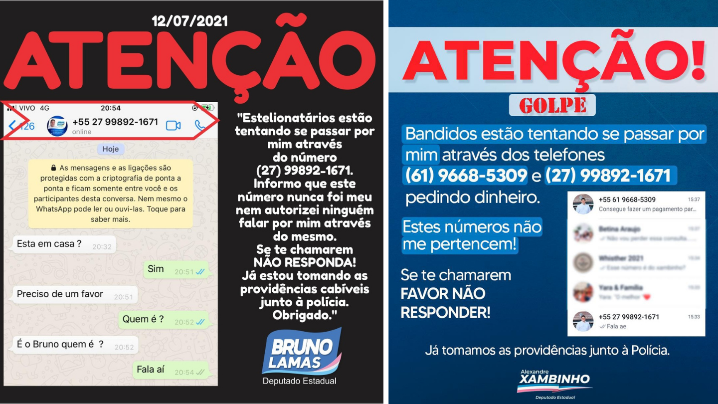 Os deputados estaduais Bruno Lamas (PSB), Xambinho (PL) e Janete de Sá (PMN) enviaram mensagens aos seus seguidores nas redes sociais esta semana com um pedido em comum: que não deem dinheiro a golpistas que estão se passando pelos parlamentares ou suas equipes por meio de telefonemas ou mensagens enviadas pelo WhatsApp.