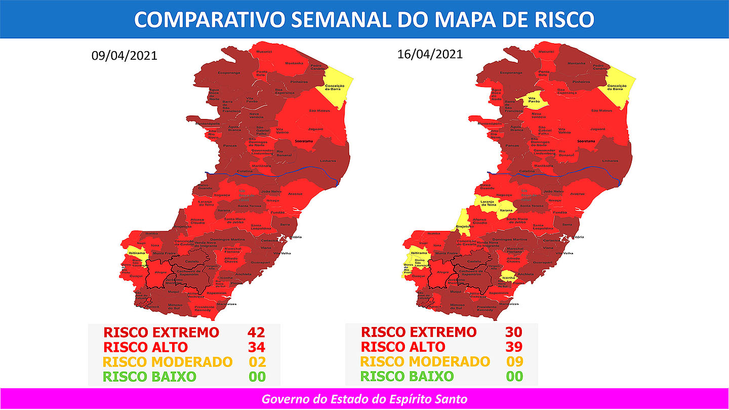 O Governo do Estado anunciou, nesta sexta-feira (16), o 51º Mapa de Risco Covid-19, que terá vigência desta segunda-feira (19) até o próximo domingo (25). Dos 78 municípios capixabas, 30 estão classificados em Risco Extremo, 39 em Risco Alto e outros nove em Risco Moderado. Não há municípios classificados em Risco Baixo.