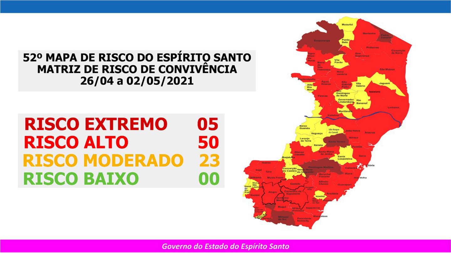 O Governador do Estado do Espírito Santo anunciou, nesta sexta-feira (23), o 52º Mapa de Risco Covid-19, que terá vigência desta segunda-feira (26) até o próximo domingo (02). Dos 78 municípios capixabas, 50 estão classificados em Risco Alto e 23 em Risco Moderado. Cinco municípios (Domingos Martins, Ecoporanga, Mimoso do Sul, Pedro Canário e Santa Teresa) seguem em Risco Extremo. Não há municípios classificados em Risco Baixo.