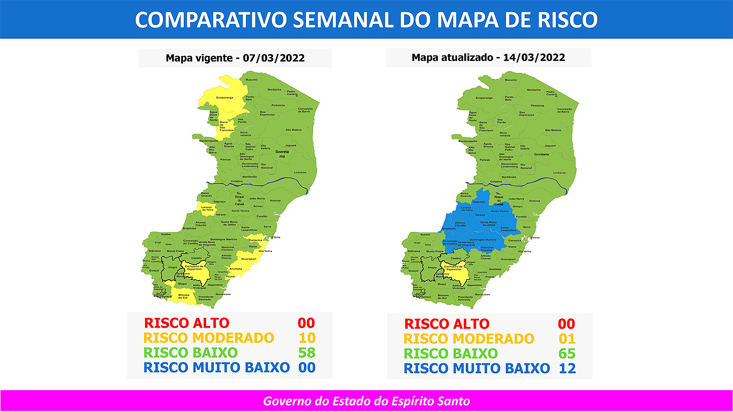 Desta forma, 12 municípios capixabas ficam classificados, de forma definitiva, como Risco Muito Baixo. Outros 65 municípios estão em Risco Baixo e apenas a cidade de Cachoeiro de Itapemirim aparece como Risco Moderado. Não há municípios classificados em Risco Alto.