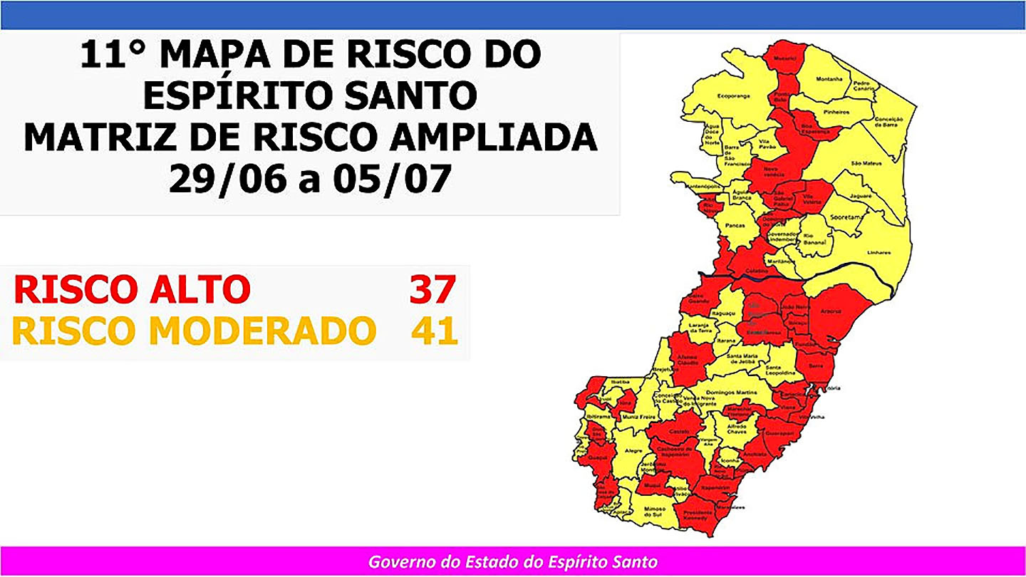 O Governo do Estado anunciou, neste sábado (27), o 11º Mapa de Risco Covid-19, que terá vigência entre a próxima segunda-feira, 29 de junho, e o domingo, 5 de julho. O Mapa classifica 37 municípios capixabas em Risco Alto e outros 41 em Risco Moderado. Castelo, Iúna, Nova Venécia e Ponto Belo passam agora para o Risco Alto e terão que seguir as medidas qualificadas pelo prazo mínimo de 14 dias. Águia Branca, Alfredo Chaves, Ecoporanga, Itarana e Mantenópolis foram para Risco Moderado.