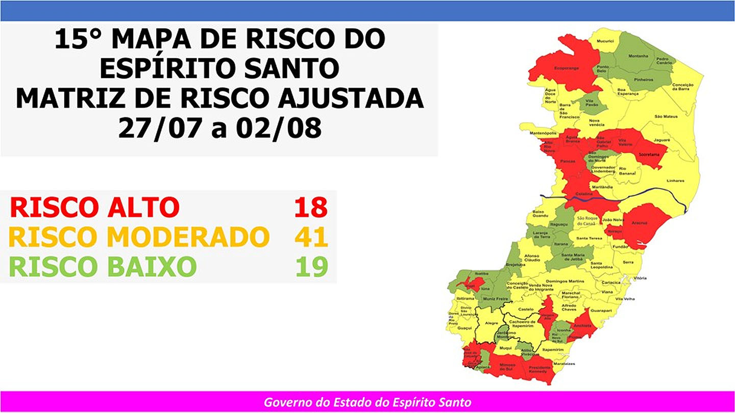 O Governo do Estado anunciou, neste sábado (25), o 15º Mapa de Risco Covid-19, que terá vigência entre a próxima segunda-feira (27) e o domingo (2). Ao todo, 19 municípios capixabas estão classificados em Risco Baixo, outros 41 estão em Risco Moderado e 18 em Risco Alto. Entre as mudanças desta atualização, Cariacica saiu do Risco Alto para Moderado. Com isso, todas as cidades da Grande Vitória deixaram a classificação de risco mais elevada.