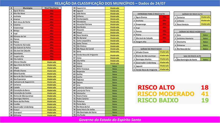 RISCO BAIXO: Apiacá, Atílio Vivácqua, Brejetuba, Ibatiba, Iconha, Iúna, Itaguaçu, Itarana, Jerônimo Monteiro, Laranja da Terra, Montanha, Muniz Freire, Pedro Canário, Pinheiros, Ponto Belo, Rio Novo do Sul, São Domingos do Norte, Santa Maria de Jetibá e Vila Pavão.