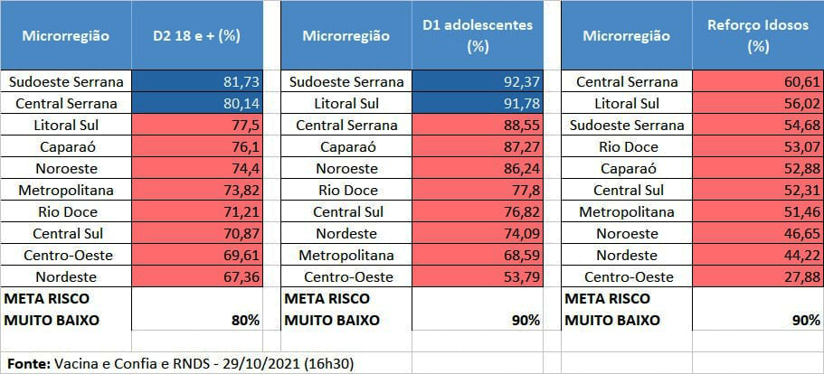 RISCO BAIXO: Afonso Cláudio, Água Doce do Norte, Águia Branca, Alegre, Alfredo Chaves, Alto Rio Novo, Anchieta, Apiacá, Aracruz, Atílio Vivácqua, Baixo Guandu, Barra de São Francisco, Boa Esperança, Bom Jesus do Norte, Brejetuba, Cachoeiro de Itapemirim, Castelo, Cariacica, Colatina, Conceição da Barra, Conceição do Castelo, Divino de São Lourenço, Domingos Martins, Dores do Rio Preto, Ecoporanga, Fundão, Governador Lindenberg, Guaçuí, Guarapari, Ibiraçu, Ibitirama, Iconha, Irupi, Itaguaçu, Itapemirim, Itarana, Iúna, Jaguaré, Jerônimo Monteiro, João Neiva, Laranja da Terra, Linhares, Mantenópolis, Marataízes, Marechal Floriano, Marilândia, Mimoso do Sul, Montanha, Mucurici, Muniz Freire, Muqui, Nova Venécia, Pancas, Pedro Canário, Pinheiros, Piúma, Ponto Belo, Presidente Kennedy, Rio Bananal, Rio Novo do Sul, Santa Leopoldina, Santa Teresa, São Domingos do Norte, São Gabriel da Palha, São José do Calçado, São Mateus, São Roque do Canaã, Serra, Sooretama, Vargem Alta, Venda Nova do Imigrante, Viana, Vila Pavão, Vila Valério, Vila Velha e Vitória.