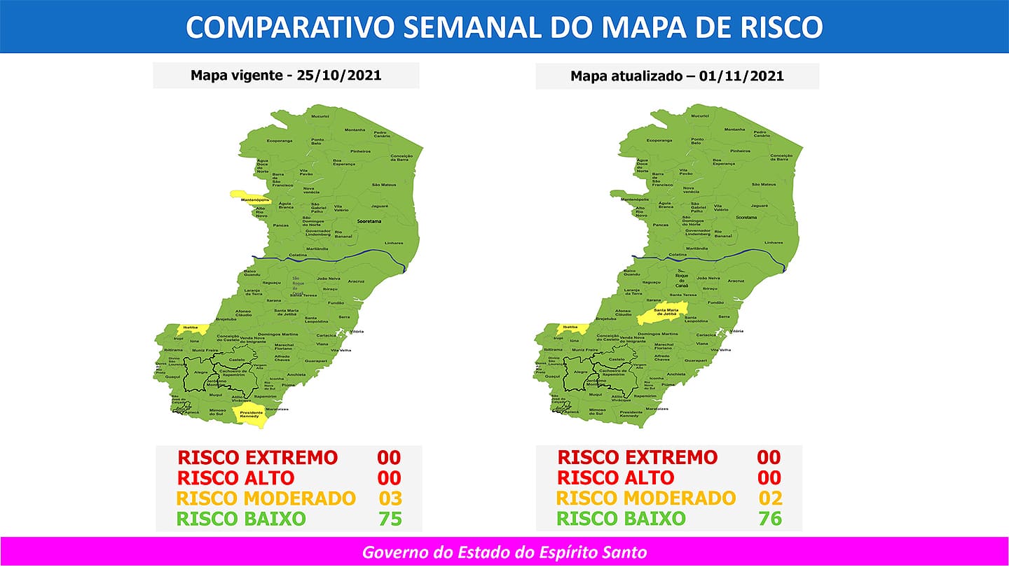 O Governo do Estado anunciou, nesta sexta-feira (29), o 79º Mapa de Risco Covid-19, que terá vigência desta segunda-feira (1º) até o próximo domingo (7). Dos 78 municípios capixabas, 76 estão classificados em Risco Baixo e apenas dois (Ibatiba e Santa Maria de Jetibá) em Risco Moderado. Não há municípios em Risco Alto.