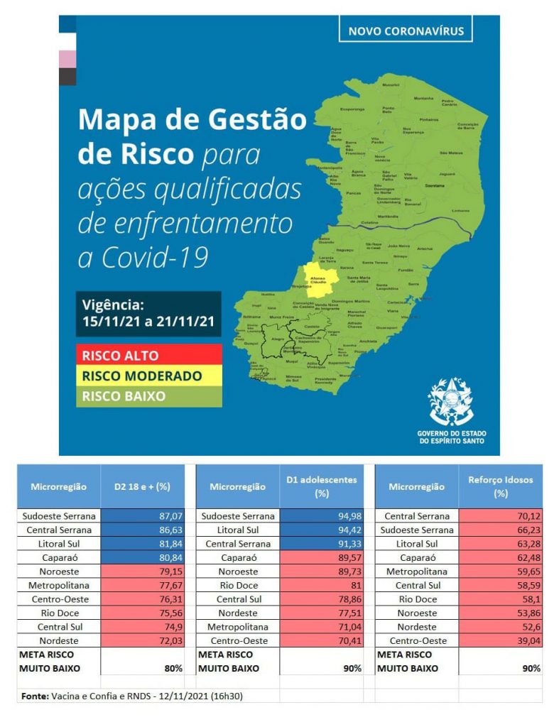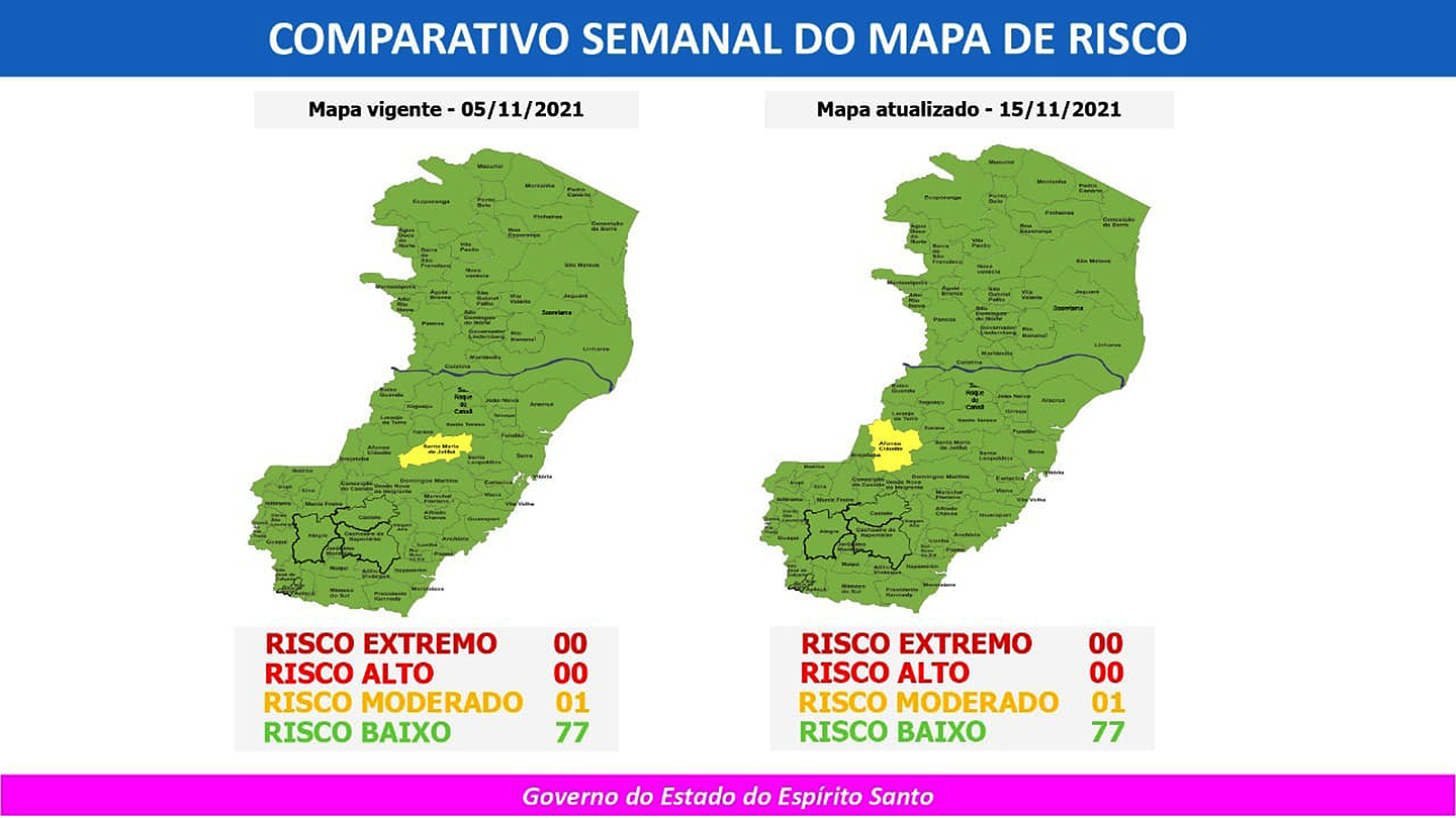 O Governo do Estado anunciou, nesta sexta-feira (12), o 81º Mapa de Risco Covid-19, que terá vigência desta segunda-feira (15) até o próximo domingo (21). Dos 78 municípios capixabas, 77 estão classificados em Risco Baixo e somente um (Afonso Cláudio) em Risco Moderado. Nenhuma microrregião conseguiu atingir os três índices para a classificação de Risco Muito Baixo.