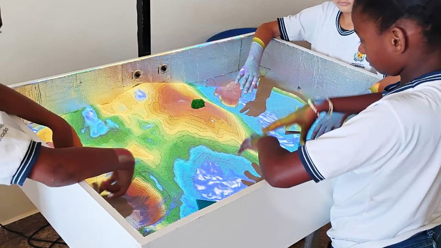 Essa ferramenta permite que os alunos moldem a areia com as mãos, criando representações físicas de terrenos, incluindo elementos como vegetação, florestas, embarcações e outro. O sistema então projeta sobre a superfície um mapa topográfico com cores de elevação e simulação de água, tornando o aprendizado mais concreto, visual e envolvente.