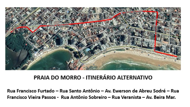 Para quem trafega no sentido Centro X Praia do Morro, o acesso será pela Rua Francisco Furtado, praça Philomeno Pereira Ribeiro, Rua Joaquim Neves e Rua São Pedro.