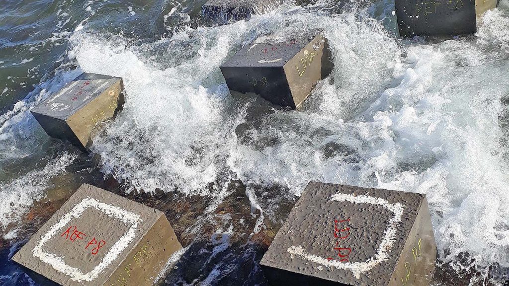 Os pesquisadores instalaram os blocos na zona de maré, que é a área de maior impacto. Os blocos são submetidos a ciclos de molhagem-secagem o que intensifica a degradação do concreto, ou seja os blocos ficam completamente submersos.