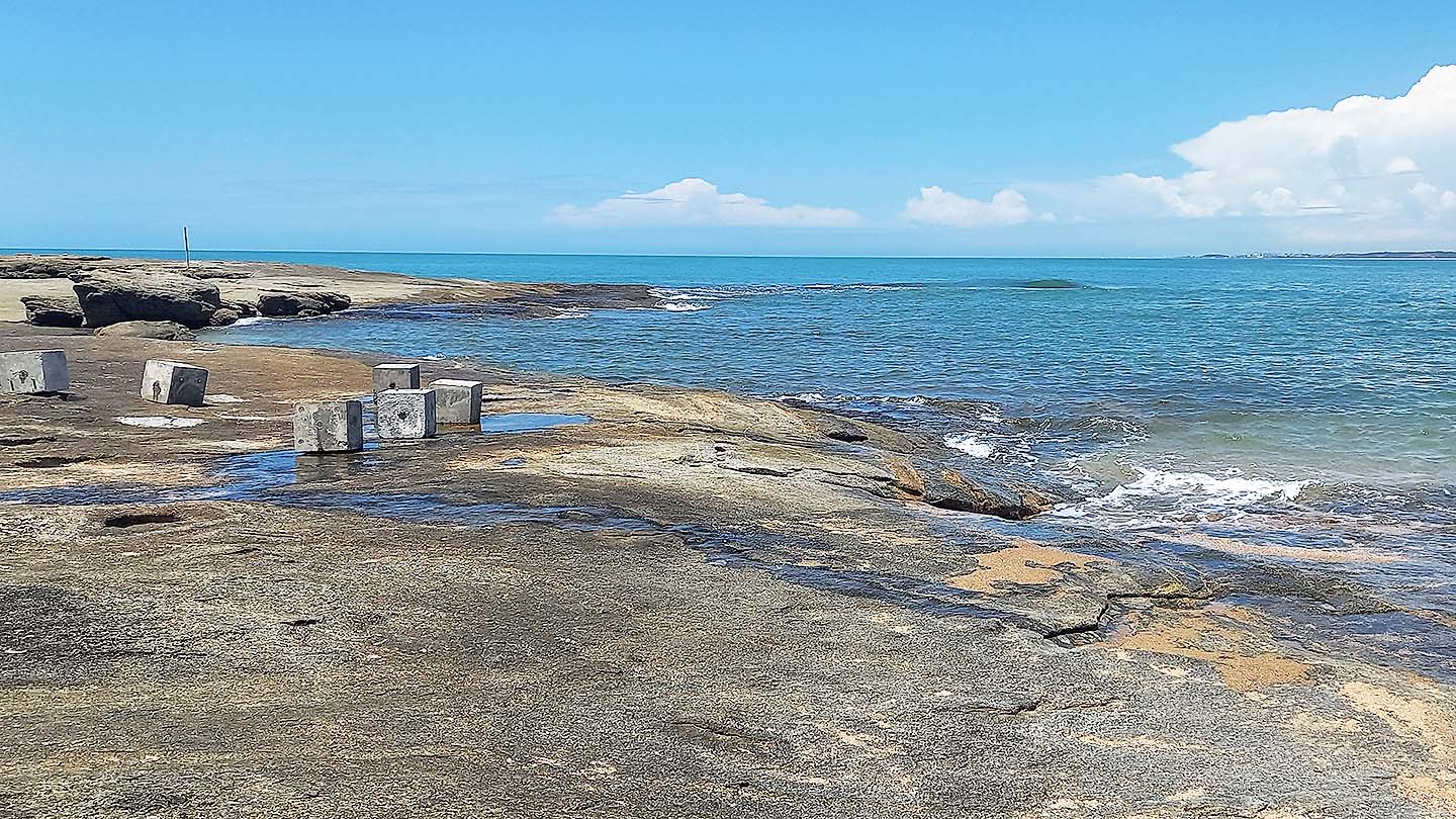Foram instalados também blocos na zona de respingo, em que o impacto da maré é intermediário, existe um baixo contato com a água do mar, apenas gotículas e nunca estão submersos.