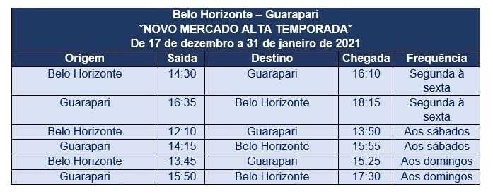 “A entrada desses dois novos destinos, tão queridos pelos mineiros, tem o intuito de atender os passageiros que desejam retomar as viagens a lazer durante a alta temporada. Nossa ideia é manter as operações com a máxima segurança possível para que todos tenham a tranquilidade e confiança em voar e circular pelo terminal. Queremos sempre ampliar a conectividade de Minas Gerais com o Brasil”, avalia Clayton Begido, gestor de Conectividade e Aviação da BH Airport.