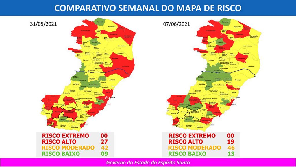O Governo do Estado anunciou, nesta sexta-feira (4), o 58º Mapa de Risco Covid-19, que terá vigência desta segunda-feira (7) até o próximo domingo (13). Dos 78 municípios capixabas, 13 estão classificados em Risco Baixo, 46 em Risco Moderado e outros 19 em Risco Alto.