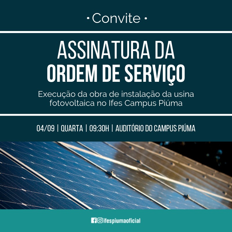 Será assinada na próxima quarta-feira, dia 04 de setembro, no auditório do IFES Campus Piúma, às 9:30h, a ordem de serviço para execução da obra de instalação da primeira *usina fotovoltaica da região litoral sul do Espírito Santo.