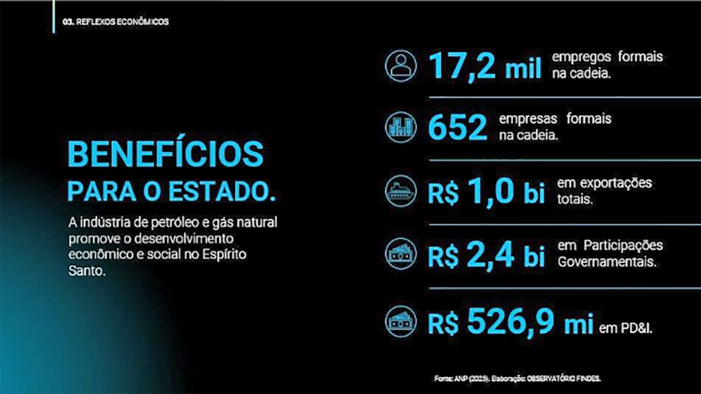 Os dados apresentados reforçam a relevância do setor para a economia capixaba. Em 2025, a produção de petróleo no Estado é estimada em 192,9 mil barris por dia, colocando o Espírito Santo na segunda posição nacional. Já a produção de gás natural deve alcançar 5,08 milhões de metros cúbicos por dia, ocupando a quarta colocação no país.