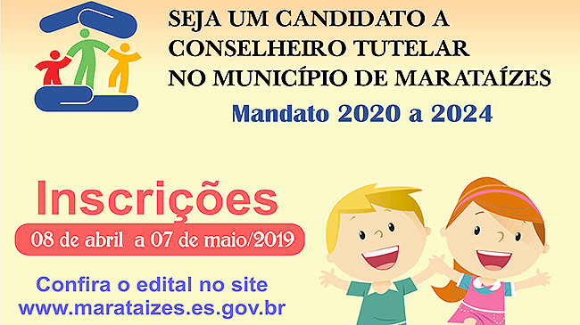 Está em vigor o edital de convocação para novos membros do Conselho Tutelar de Marataízes para o quadriênio de 10 de janeiro 2020 a 09 de janeiro de 2024. O Conselho Municipal dos Direitos da Criança e do Adolescente de Marataízes (CMDCA) publicou no Diário Oficial nº 2713 de 08 de abril. Para acessar o edital completo basta clicar no link: https://www.marataizes.es.gov.br/uploads/diario_oficial/diario-oficial-n-2713-08-04-2019-1554758330.pdf?fbclid=IwAR3U9poVupK_lijJFPTLQ5k_Nd1BXJi-FWMdt6dTWGlP3QGrJAKr2wZ4DL0