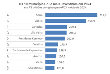 A cidade da Serra se destacou, liderando o ranking de investimentos com R$ 717,9 milhões em 2024, um recorde histórico para o município. No mesmo ano, outros 41 municípios capixabas também registraram volumes recordes.