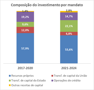Essa nova dinâmica fez com que a participação das transferências estaduais no financiamento dos investimentos saltasse de 9,6% para 22,1% no período. Em contrapartida, a participação dos recursos da União e das operações de crédito diminuiu.