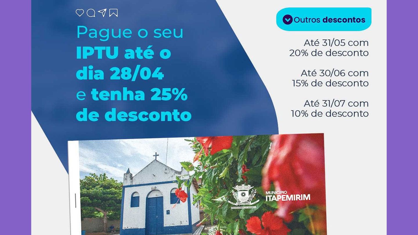 A prefeitura de Itapemirim estabeleceu prazos e descontos para quem for pagar o imposto. Se o contribuinte não conseguir pagar o IPTU em cota única até 28 de abril, poderá quitar até 31 de maio com desconto de 20%. O desconto de 15% é para aqueles que for pagar na data limite de 30 de junho e de 10% para pagamento até 31 de julho. Ainda existe a possibilidade da prorrogação até o dia 31 de agosto, porém, em cota única sem desconto.