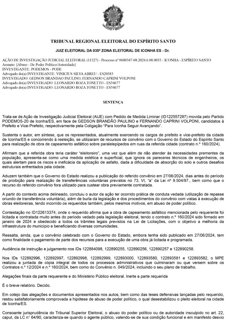 A Justiça Eleitoral decidiu no sábado (28) barrar a candidatura de Gedson Brandão Paulino (Republicanos) e de seu vice, Fernando Caprini Volponi (Republicanos), à reeleição na prefeitura de Iconha. A decisão foi proferida pelo juiz eleitoral da 35ª Zona Eleitoral, Dr. Ralfh Rocha de Souza, em uma Ação de Investigação Judicial Eleitoral (AIJE) protocolada pelo partido Podemos.
