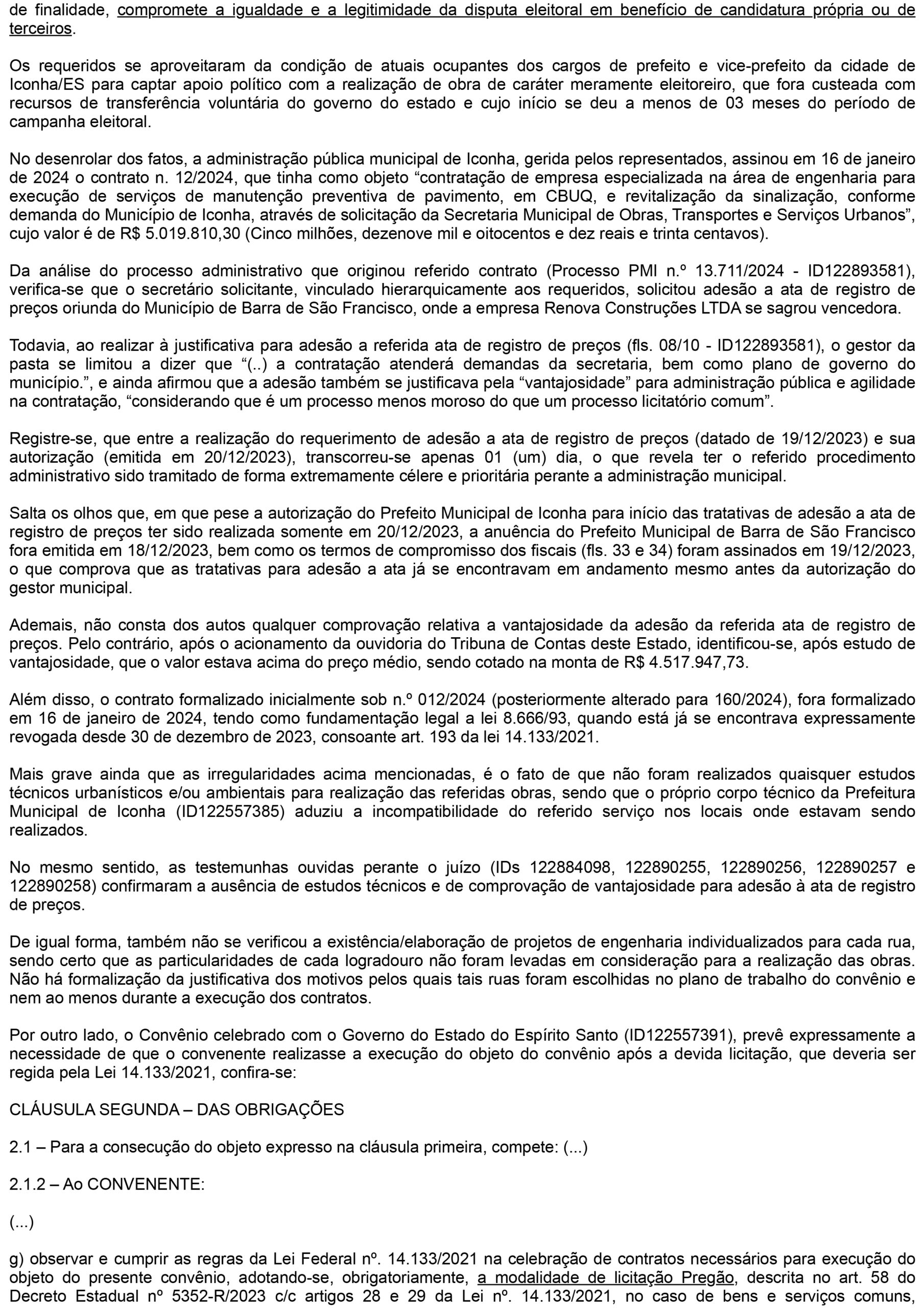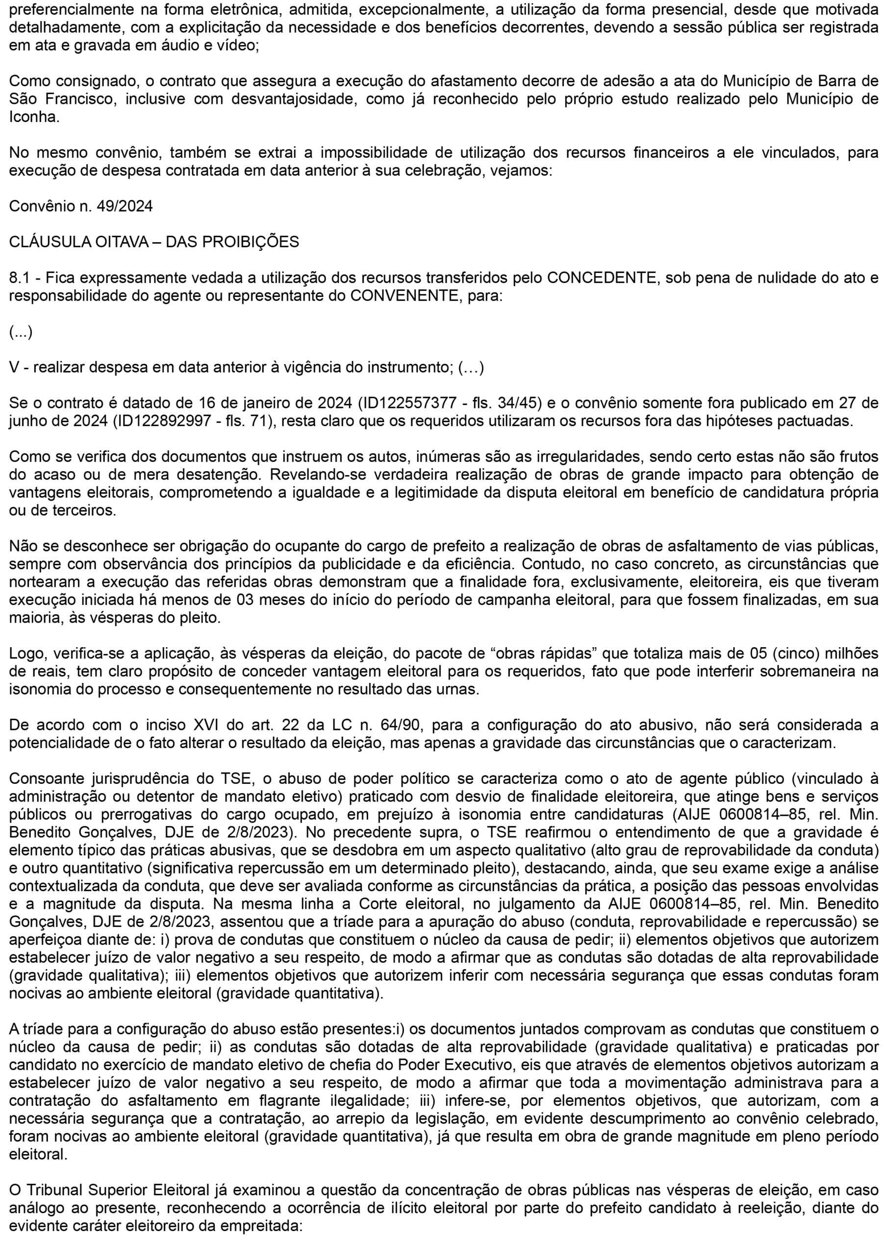 A ação apontou que os candidatos teriam cometido abuso de poder político ao utilizarem recursos de um convênio com o Governo do Estado para realizar obras de capeamento asfáltico em vias da cidade já pavimentadas. Segundo a denúncia, as obras, iniciadas a menos de três meses do período eleitoral, teriam caráter “eleitoreiro”, buscando angariar votos por meio de melhorias superficiais que não atenderiam às reais necessidades da população.