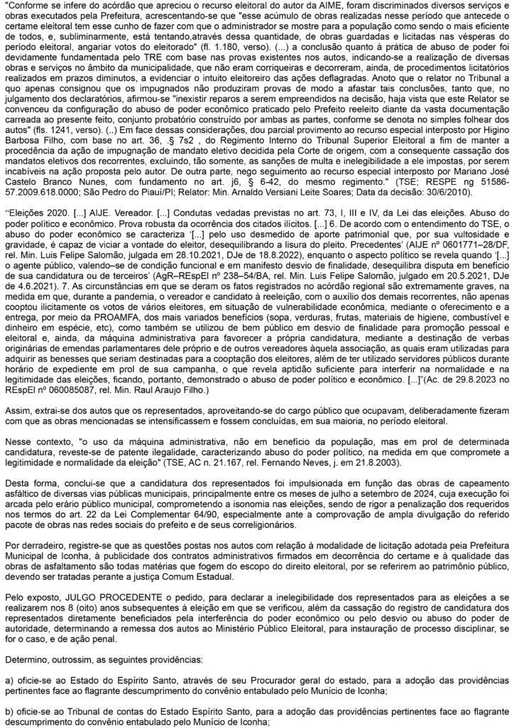 A sentença destacou a prática de condutas vedadas pela legislação eleitoral, além de irregularidades nos trâmites administrativos das obras, como a falta de estudos técnicos adequados e a utilização de recursos públicos de maneira inadequada. O juiz concluiu que a administração municipal utilizou recursos que não podiam ser aplicados para despesas anteriores à celebração do convênio, além de infringir normas de licitação.
