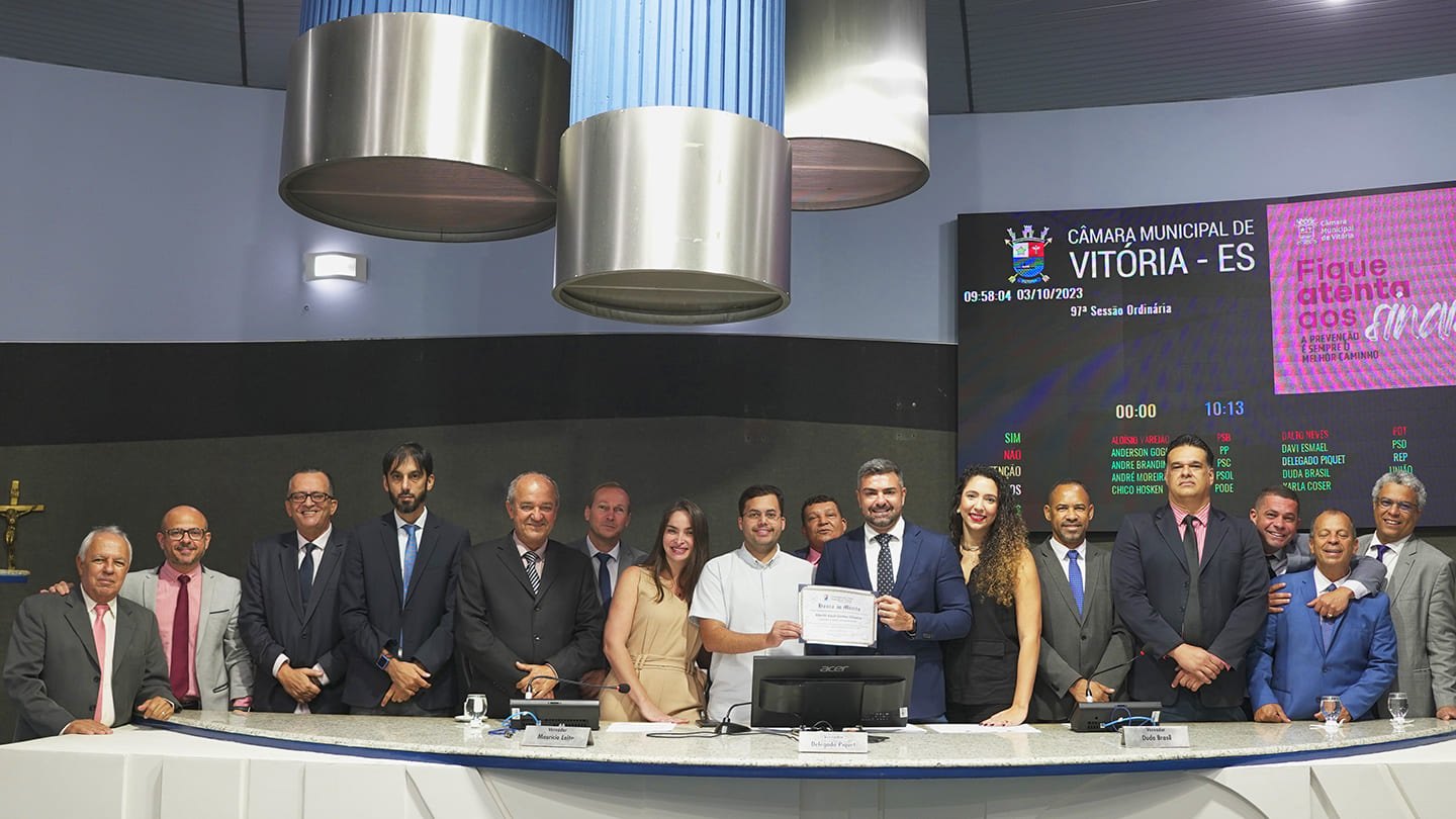 Na última terça-feira (03), Kauê foi homenageado por todos os vereadores da Câmara Municipal de Vitória. O certificado de Honra ao Mérito destacou sua notável contribuição para o município de Vitória e sua habilidade em manter uma relação harmoniosa entre a Câmara de Vitória e a prefeitura municipal.