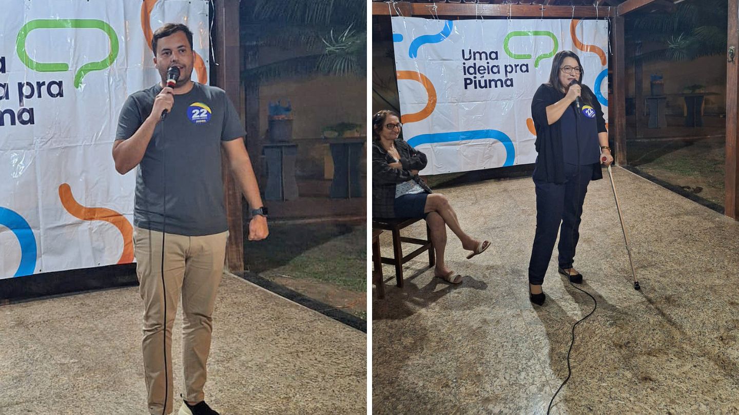 Kauê Oliveira e Valdete Pires durante discurso.