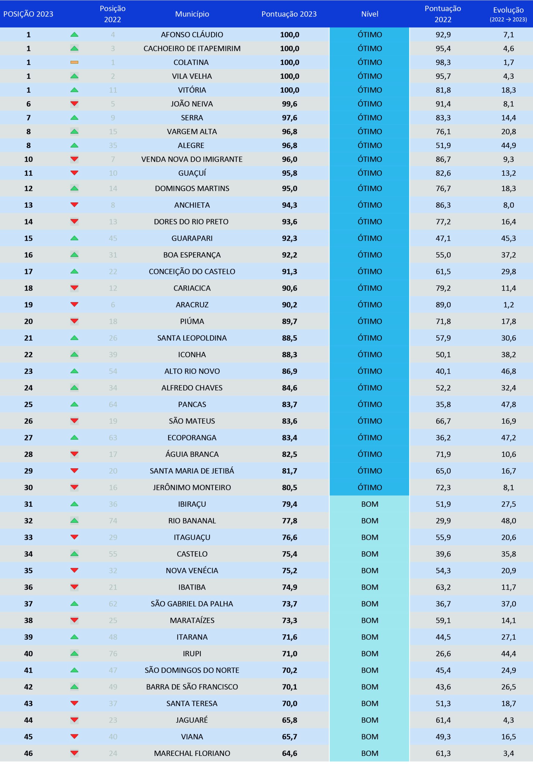Em uma escala de 0 a 100, cinco prefeituras alcançaram a nota máxima, atendendo todos os critérios do ranking e ocupando o 1º lugar: Afonso Cláudio, Cachoeiro de Itapemirim, Colatina. Vila Velha e Vitória. Muito próxima na classificação, ficou João Neiva (99,57 pontos), em 6º lugar.