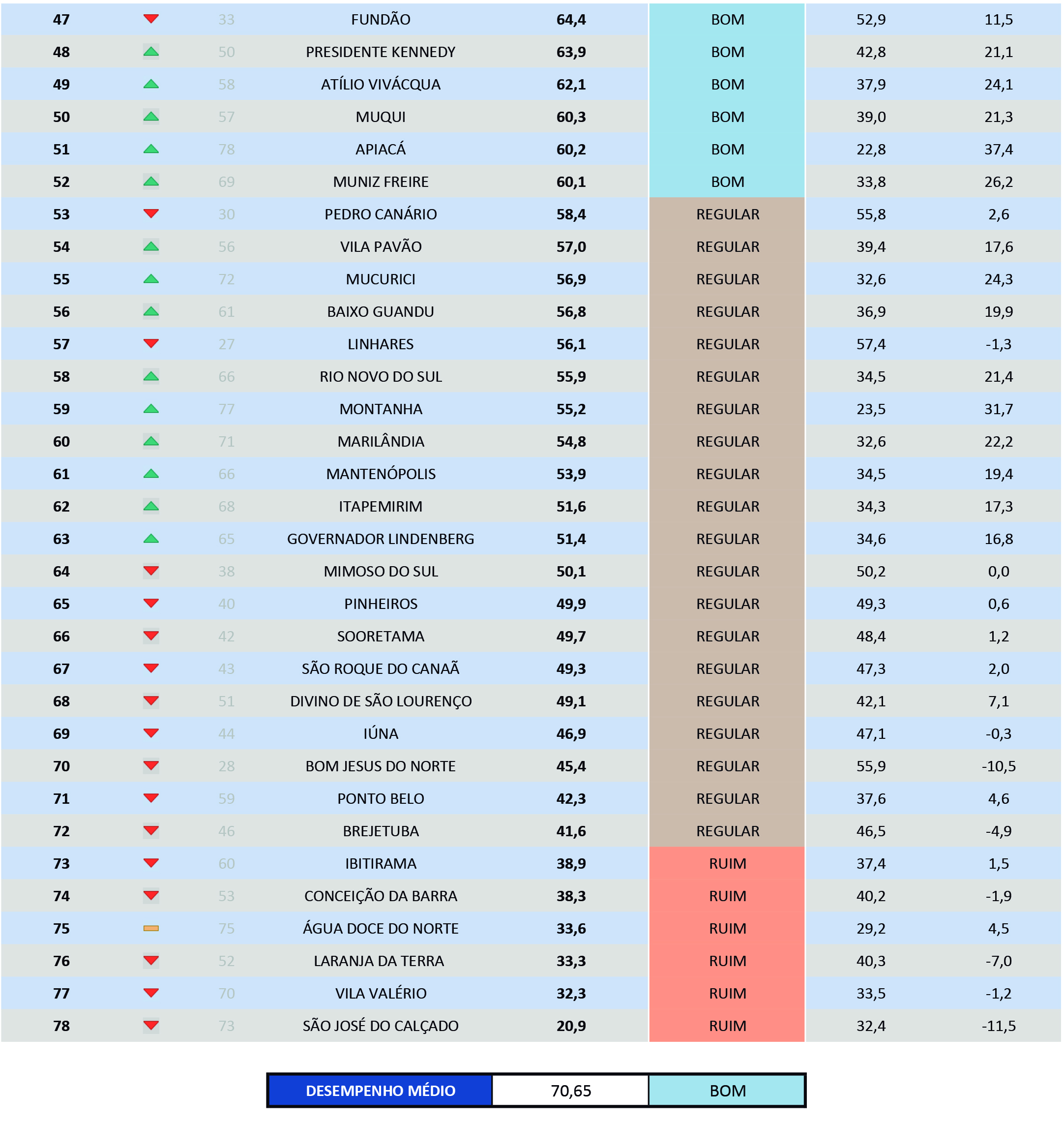Dos 78 municípios avaliados, 52 obtiveram a classificação “ótimo” ou “bom”. Ao todo, 71 municípios tiveram avanço em suas notas e a média geral subiu de 53,65 pontos, em 2022, para 70,73 pontos, em 2023.
