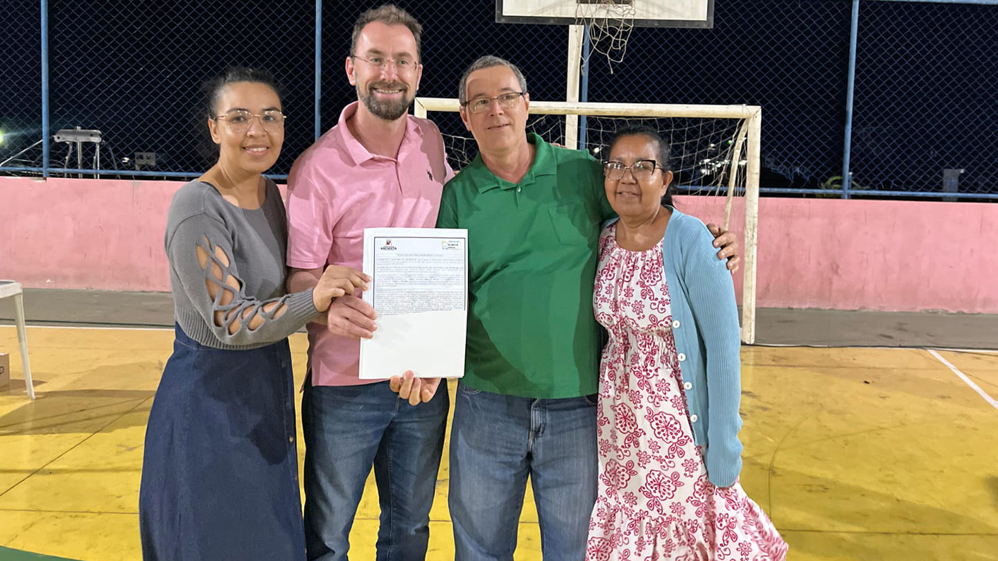 A solenidade de entrega de posse legal aconteceu na quadra poliesportiva da comunidade com a presença do prefeito Fabrício Petri.