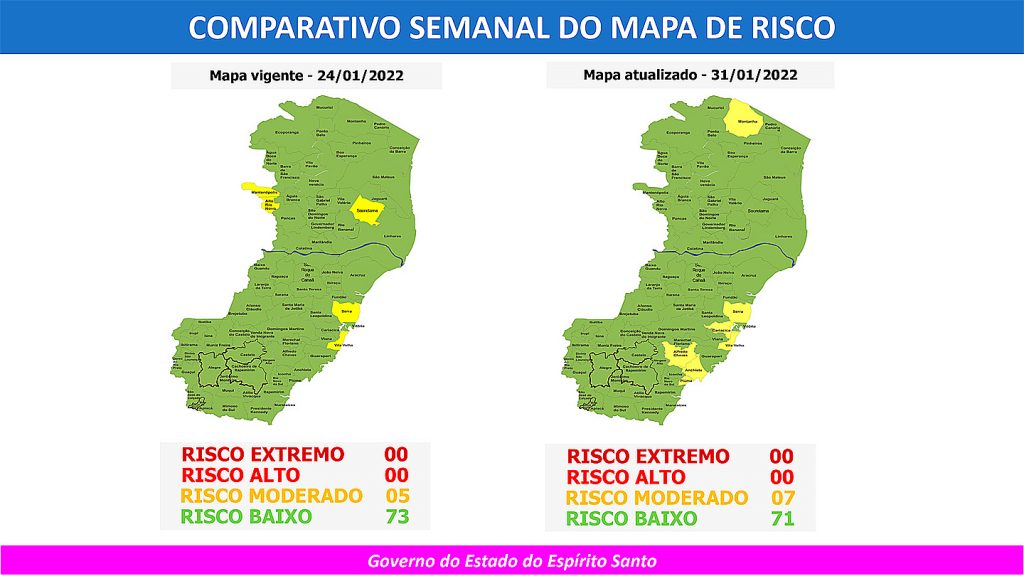 O Governo do Estado anunciou nesta sexta-feira (28), o 92º Mapa de Risco Covid-19, que terá vigência desta segunda-feira (31) até o próximo domingo (06). Dos 78 municípios capixabas, 71 estão classificados em Risco Baixo e sete municípios ficarão em Risco Moderado. Não há municípios classificados em Risco Alto.