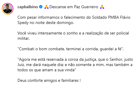 A notícia foi confirmada através das redes sociais do capitão Balbino, do 8º Batalhão da PM de Colatina, município onde o policial estava internado desde o dia 17 de setembro.