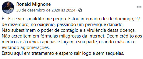 Ronald estava internado no Hospital Santa Mônica, em Vila Velha, desde o dia 27 de dezembro no oxigênio e, em suas redes sociais, ele deixou uma mensagem pedindo para que as pessoas deem crédito aos médicos e que cada um faça sua parte usando máscara e evitando aglomerações.